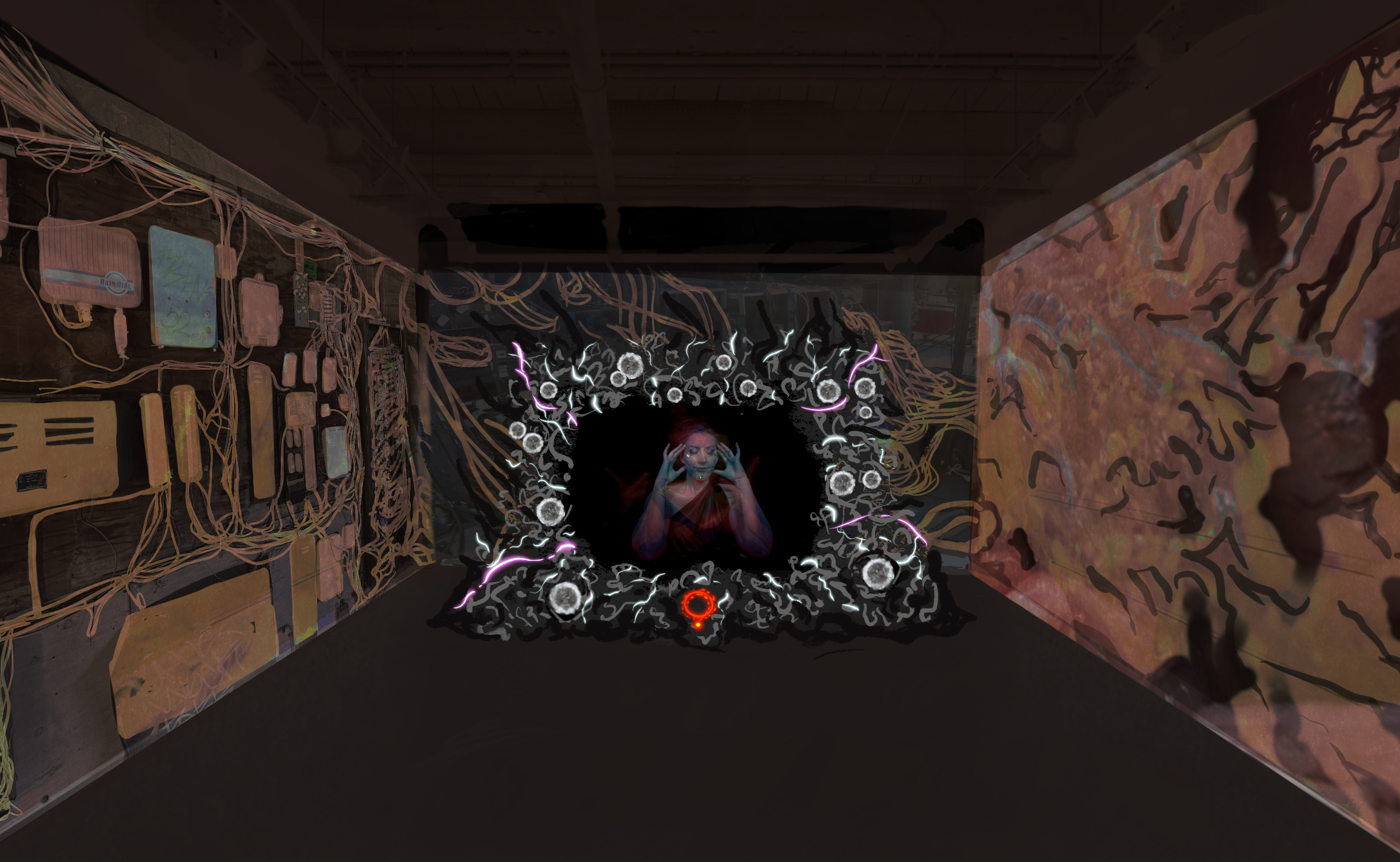 This is a site-adaptive installation. In the center, a large sculptural hearth encrusted in porcelain foliage vibrates, absolutely dripping in beaded neon. It holds a glowing humanoid projection. As the figure moves, the neon and wall projections ripple and pulse in response. This is the active core of Trans-Dimensional muxing.